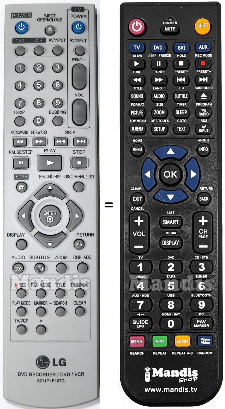 Di seguito, vi mostreremo la corrispondenza tra ciascun pulsante del telecomando originale e il pulsante che svolge la stessa funzione sul telecomando di sostituzione. In alcuni casi, potrebbe essere necessario premere il tasto SHIFT prima di premere un altro pulsante per eseguire determinate azioni. Queste funzioni aggiuntive sono spesso poco utilizzate e sono incluse per facilitare la comprensione del telecomando di sostituzione, o perché il telecomando originale ha più pulsanti rispetto al suo equivalente.