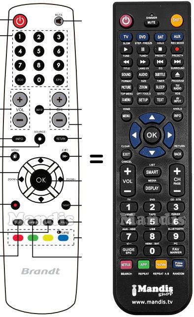 Di seguito, vi mostreremo la corrispondenza tra ciascun pulsante del telecomando originale e il pulsante che svolge la stessa funzione sul telecomando di sostituzione. In alcuni casi, potrebbe essere necessario premere il tasto SHIFT prima di premere un altro pulsante per eseguire determinate azioni. Queste funzioni aggiuntive sono spesso poco utilizzate e sono incluse per facilitare la comprensione del telecomando di sostituzione, o perché il telecomando originale ha più pulsanti rispetto al suo equivalente.