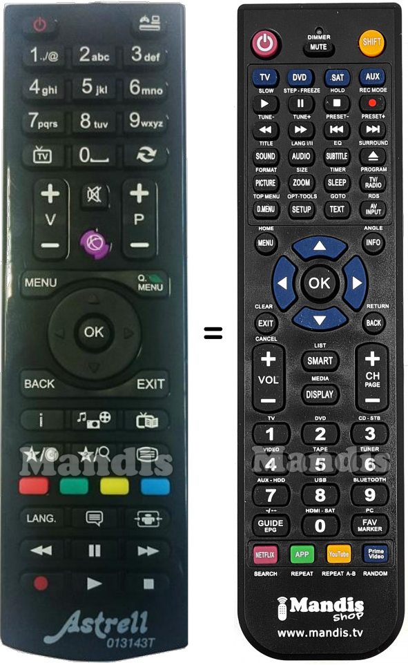 Di seguito, vi mostreremo la corrispondenza tra ciascun pulsante del telecomando originale e il pulsante che svolge la stessa funzione sul telecomando di sostituzione. In alcuni casi, potrebbe essere necessario premere il tasto SHIFT prima di premere un altro pulsante per eseguire determinate azioni. Queste funzioni aggiuntive sono spesso poco utilizzate e sono incluse per facilitare la comprensione del telecomando di sostituzione, o perché il telecomando originale ha più pulsanti rispetto al suo equivalente.