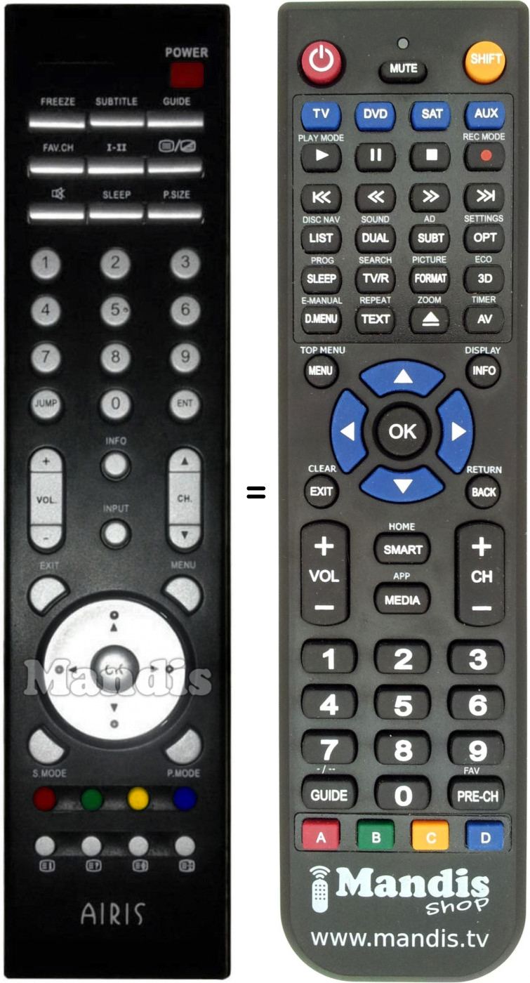 Di seguito, vi mostreremo la corrispondenza tra ciascun pulsante del telecomando originale e il pulsante che svolge la stessa funzione sul telecomando di sostituzione. In alcuni casi, potrebbe essere necessario premere il tasto SHIFT prima di premere un altro pulsante per eseguire determinate azioni. Queste funzioni aggiuntive sono spesso poco utilizzate e sono incluse per facilitare la comprensione del telecomando di sostituzione, o perché il telecomando originale ha più pulsanti rispetto al suo equivalente.