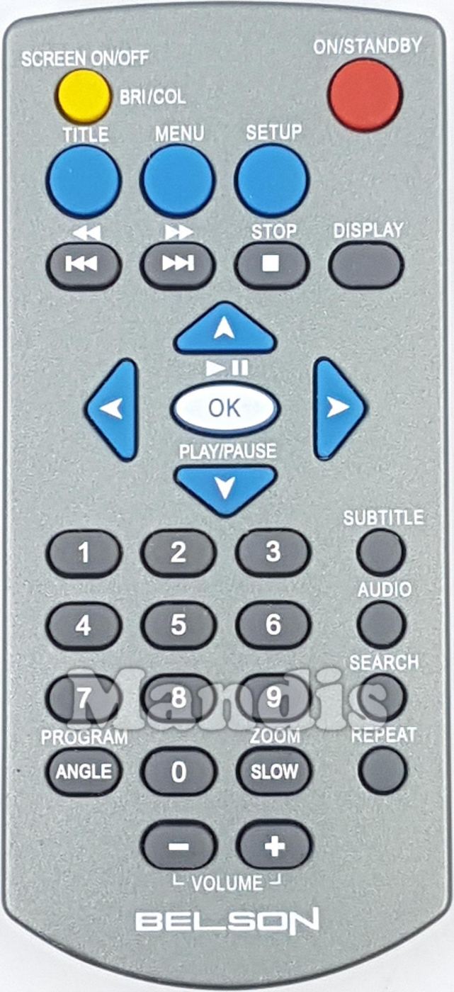 On/Standby, ScrennOn/Off/Bri/Col, Title, Menu, Setup, I<</<<, >>I/>>, Stop, Display, Up, Down, OK/Play/Pause, Right, Left, Subtitle, Audio, Search, Repeat, 1, 2, 3, 4, 5, 6, 7, 8, 9, 0, Angle/Program, Slow/Zoom, Volume+, Volume-