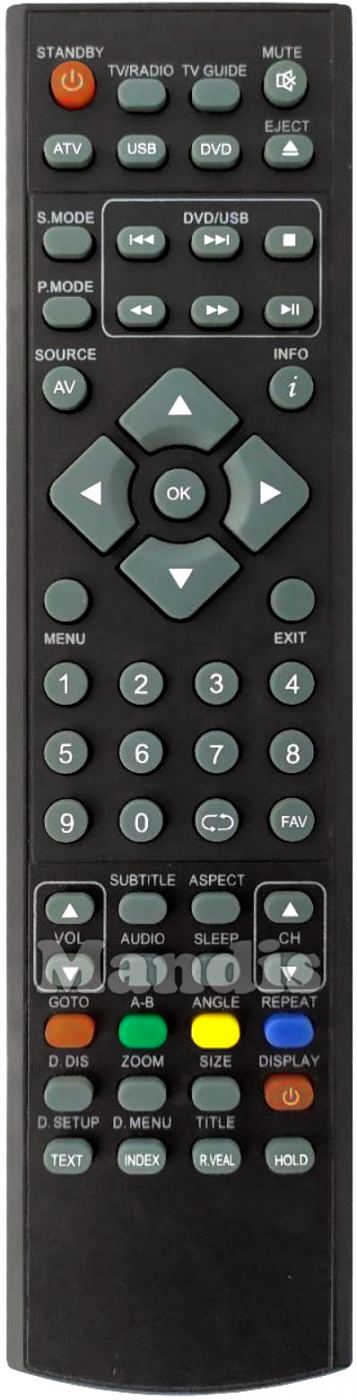 Standby, TV / Radio, TV Guide, Mute, ATV, USB, DVD, Eject, S.Mode, P.Mode, DVD/USB I<<, DVD/USB >>I, DVD/USB Stop, DVD/USB <<, DVD/USB >>, DVD/USB Play/Pause, AV / Source, Info, Up, Right, Down, Left, OK, Menu, Exit, 1, 2, 3, 4, 5, 6, 7, 8, 9, 0, Recall, FAV, Vol +, Vol -, Subtitle, Aspect, Audio, Sleep, CH +, CH -, Red / Goto, Green / A-B, Yellow / Angle, Blue / Repeat, D.Dis, Zoom, Size, Power Display, Text / D.Setup, Index / D.Menu, R.VEAL /Title, Hold