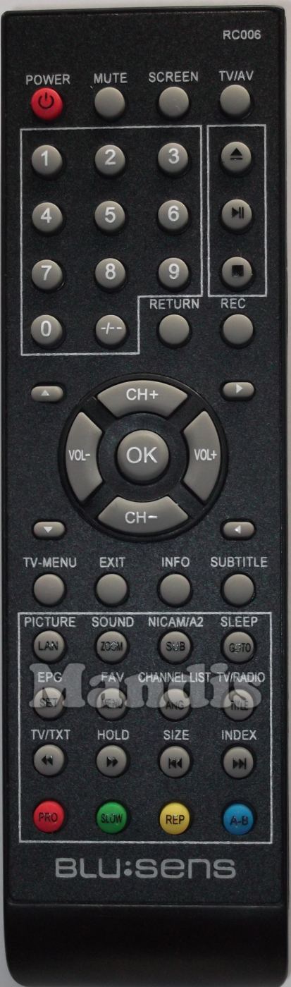 POWER, MUTE, SCREEN, TV/AV, 1, 2, 3, 4, 5, 6, 7, 8, 9, 0, -/--, EJECT, PLAY/PAUSE, STOP, RETURN, REC, UP, DOWN, RIGHT, LEFT, OK, CH+, CH-, VOL+, VOL-, TV-MENU, EXIT, INFO, SUBTITLE, LAN/PICTURE, ZOOM/SOUND, SUB/NICAM/A2, GOTO/SLEEP, SET/EPG, MENU/FAV, ANG/CHANNEL LIST, TITLE/TV/RADIO, <</TV/TXT, >>/HOLD, I<</SIZE, >>I/INDEX, RED/PRO, GREEN/SLOW, YELLOW/REP, BLUE/A-B