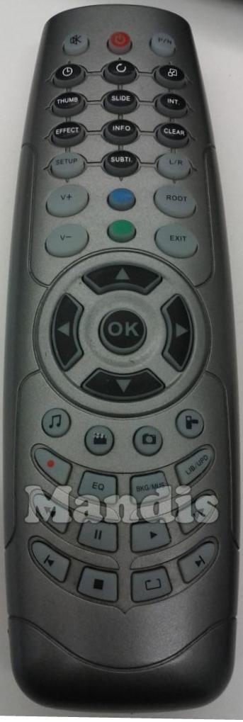 mute, power, p/n, timer, recall, [⌂], thumb, slide, int, effect, info, clear, substi, setup, l/r, v+, v-, root, exit, blue, green, ok, up, down, right, left, music, movie, camera, video, rec, eq, bkg/mus, LIB/UPD, <<, pause, play, >>, i<, stop, [__], >i