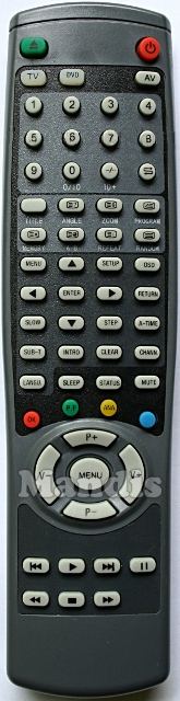 Eject, Power, TV, DVD, AV, 1, 2, 3, 4, 5, 6, 7, 8, 9, 0 / 10, -/-- / +10, Recall, Title, Reveal / Angle, Size / Zoom, Mix / Program, Cancel / Memory, Timer / A-B, Index / Repeat, Text / Random, Menu, Setup, OSD, Up, Left, Enter, Right, Down, Return, Slow, Step, A-Time, Sub-T, Intro, Clear, Chann, Langu, Sleep, Status, Mute, Red / OK, Green / P.P, Yellow / ANA, Blue, Up / P +, Down / P -, Left / V -, Right / V +, Menu, I<<, Play, >>I, Pause, <<, Stop, >>