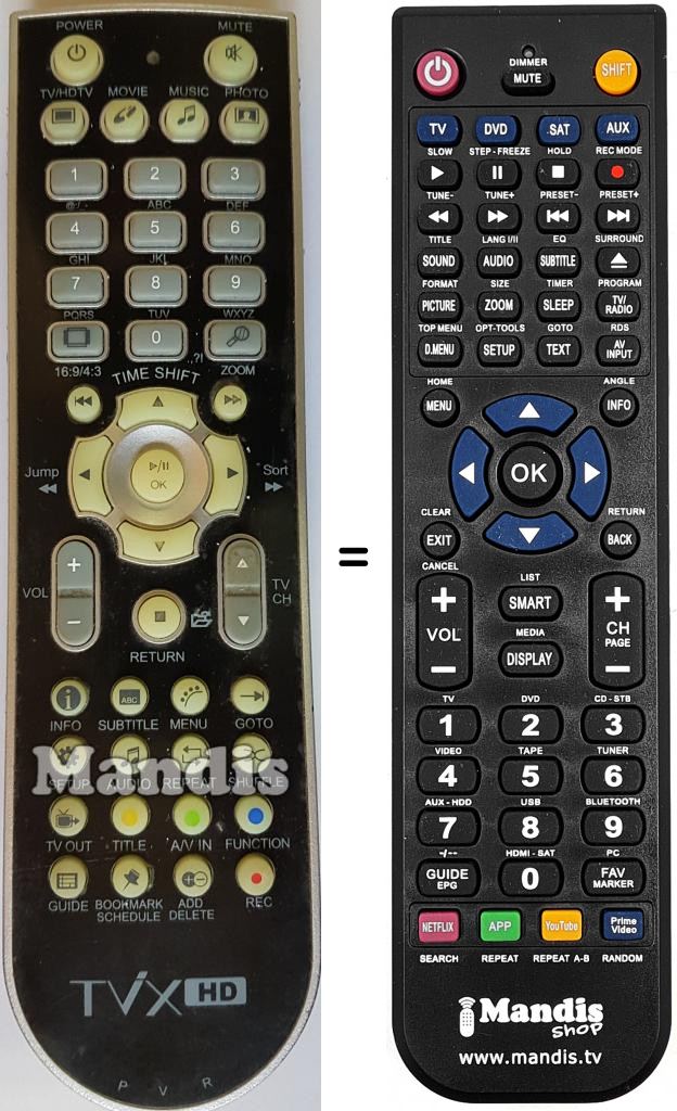 Di seguito, vi mostreremo la corrispondenza tra ciascun pulsante del telecomando originale e il pulsante che svolge la stessa funzione sul telecomando di sostituzione. In alcuni casi, potrebbe essere necessario premere il tasto SHIFT prima di premere un altro pulsante per eseguire determinate azioni. Queste funzioni aggiuntive sono spesso poco utilizzate e sono incluse per facilitare la comprensione del telecomando di sostituzione, o perché il telecomando originale ha più pulsanti rispetto al suo equivalente.