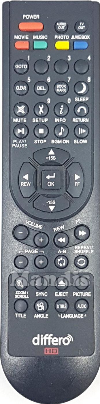 Power, Audio Out, TV Out, Red/Movie, Green/Music, Yellow/Photo, Blue/Juke Box, GOTO/1, 2, 3, 4, Clear/5, DEL./6, Book Mark/7, Sleep/8, Setup/9, Info/0, Return, Mute, Play/Pause, Stop, ♪/BGM On, II>/Slow, Up/+15S, Down/-15S, <<, >>, OK, Volume-, Volume+, <<, >>, Page-, Page+, A-B, Repeat/Shuffle, Zoom/Scroll, Sync, Eject, Picture, Title, Angle, S.Title Language, Audio Language