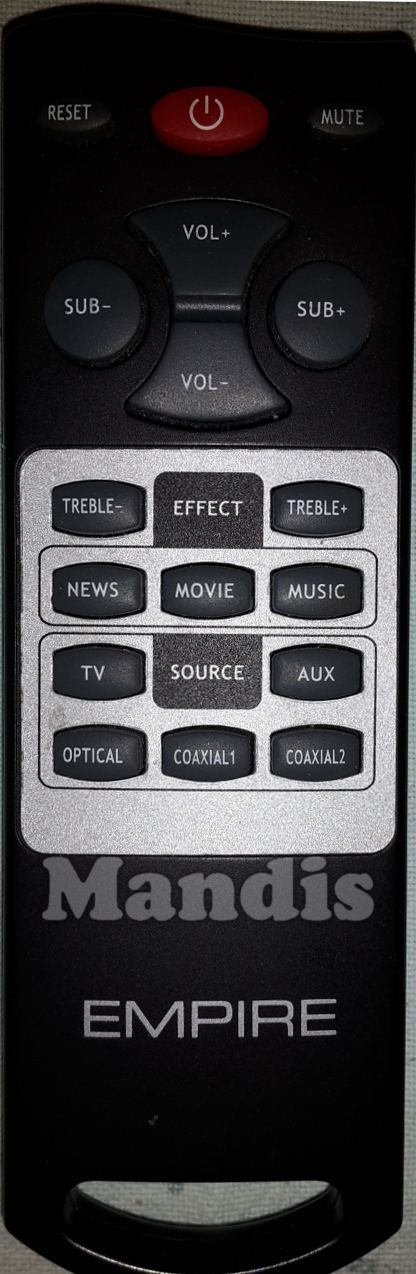 Power, Reset, Mute, Sub-, Sub+, Vol+, Vol-, Treble-, Treble+, Effect NEWS, Effect MOVIE, Effect MUSIC, Source TV, Source OPTICAL, Source COAXIAL1, Source COAXIAL2, Source AUX