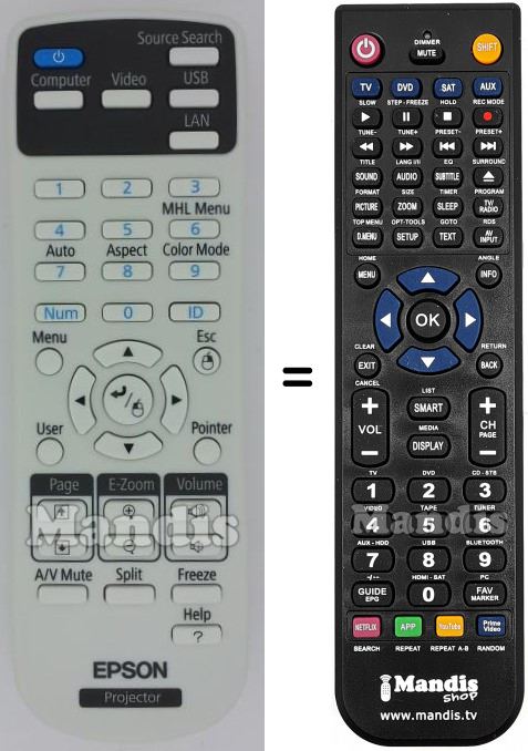 Questo telecomando esegue tutte le funzioni del telecomando originale: Power, Source Search, Computer, Video, USB, LAN, 1, 2, 3, 4, 5, MHL Menu, Auto, Aspect, 6, Color Mode, 7, 8, 9, 0, Menu, Esc, User, Pointer, Up, Down, Right, Left, Enter, A/V Mute, Split, Freeze, ?/Help, Page Up, Page Down, E-Zoom+, E-Zoom-, Vol+, Vol-, ID