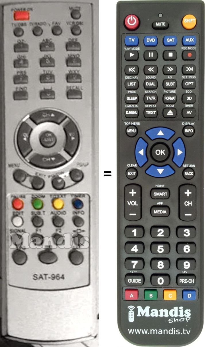 Questo telecomando sostituisce completamente il tuo SAT-964 e offre tutte le funzioni dell'originale.