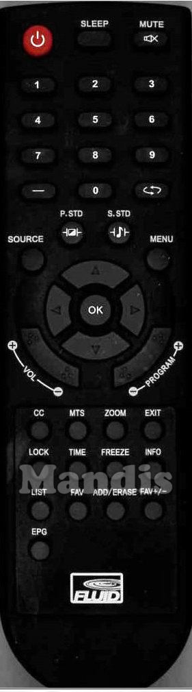 Power, Sleep, Mute, 1, 2, 3, 4, 5, 6, 7, 8, 9, 0, --, Recall, Source, P.Std, S.Std, Menu, Up, Left, OK, Right, Down, Vol+, Vol-, Program-, Program+, CC, MTS, Zoom, Exit, Lock, Time, Freeze, Info, List, Fav, Add/Erase, Fav +/-, EPG