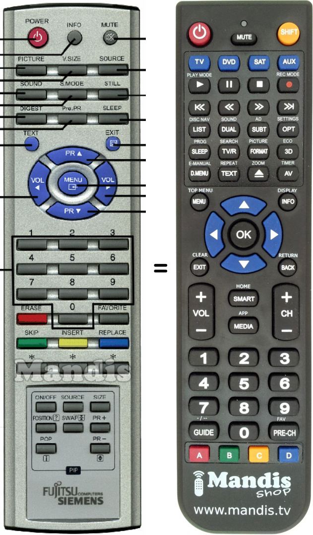 Di seguito, vi mostreremo la corrispondenza tra ciascun pulsante del telecomando originale e il pulsante che svolge la stessa funzione sul telecomando di sostituzione. In alcuni casi, potrebbe essere necessario premere il tasto SHIFT prima di premere un altro pulsante per eseguire determinate azioni. Queste funzioni aggiuntive sono spesso poco utilizzate e sono incluse per facilitare la comprensione del telecomando di sostituzione, o perché il telecomando originale ha più pulsanti rispetto al suo equivalente.