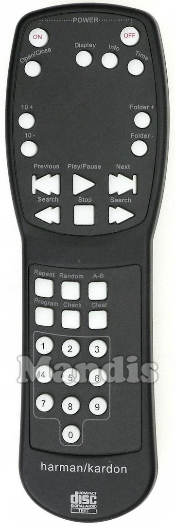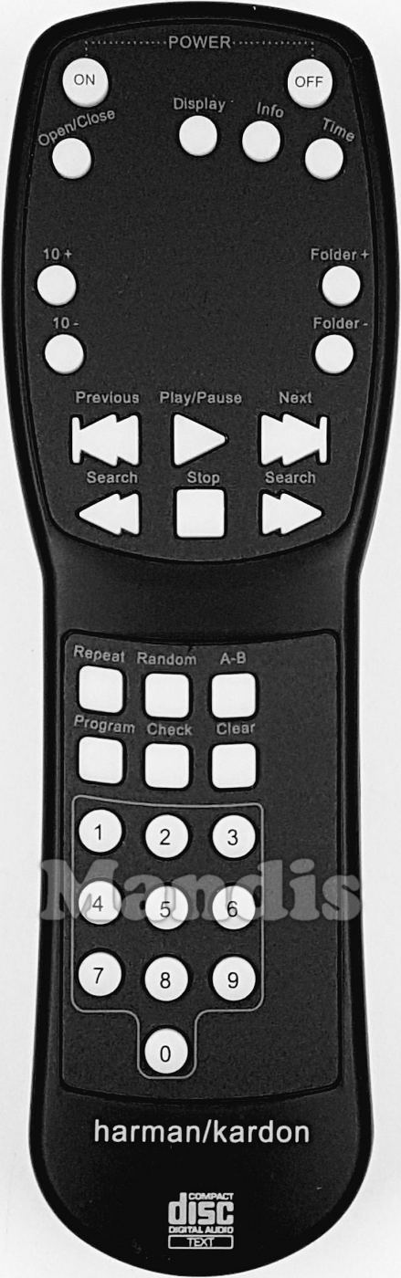 Power On, Power Off, Open / Close, Display, Info, Time, 10 +, 10 -, Folder +, Folder -, I<< Previous, Play / Pause, >>I Next, << Search, Stop, >> Search, Repeat, Random, A-B, Program, Check, Clear, 1, 2, 3, 4, 5, 6, 7, 8, 9, 0