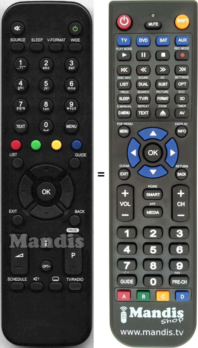 Power, Mute, Source, Sleep, V-Format, Wide, 1, 2, 3, 4, 5, 6, 7, 8, 9, 0, Text, Menu, Red, Green, Yellow, Blue, List, Guide, Up, Left, OK, Right, Down, Exit, Back, Vol+, Vol-, i, OPT+, P+ / Page+, P- / Page-, Schedule, Audio, Subtitle, TV/Radio