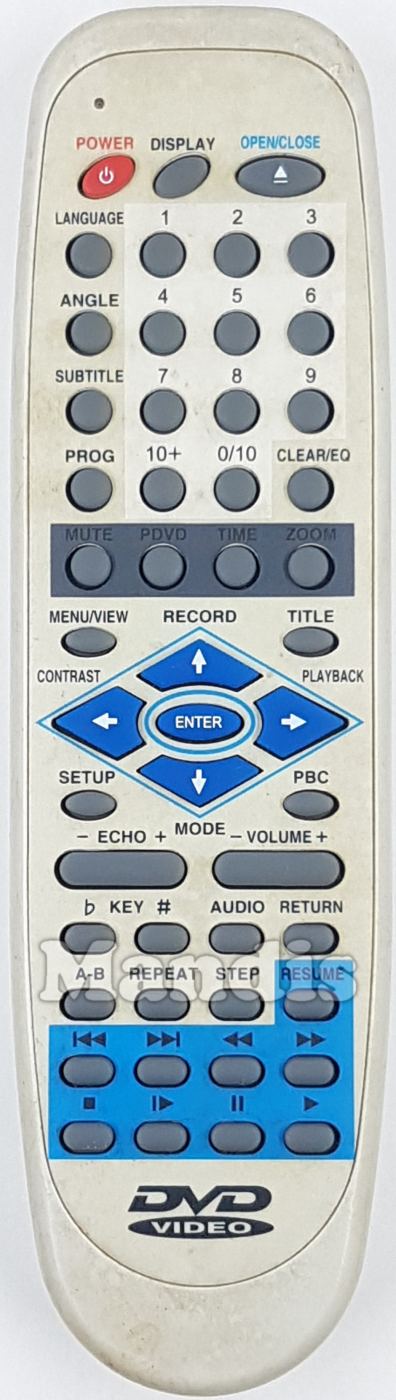 Questo telecomando ha i seguenti tasti: Power, Display, Open/Close, Language, Angle, Subtitle, PROG, 1, 2, 3, 4, 5, 6, 7, 8, 9, 10+, 0/10, Clear/EQ, Mute, PDVD, Time, Zoom, Menu/View, Title, Setup, PBC, Up/Record, Down/Mode, Left/Contrast, Right/Playback, Enter, Echo-, Echo+, Volume-, Volume+, b Key, # Key, Audio, Return, A-B, Repeat, Step, Resume, I<<, >>I, <<, >>, Stop, I>, Pause, Play
