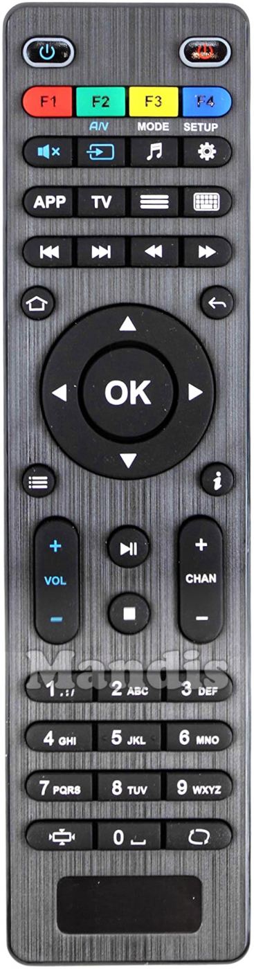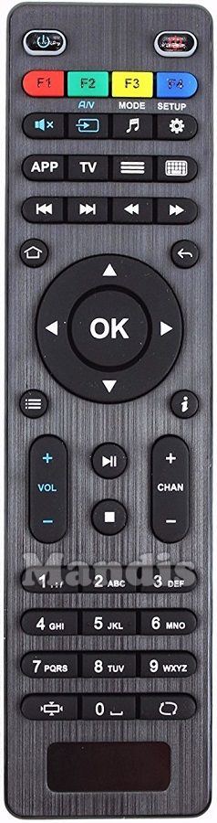Power, TV Power, Red / F1, Green / F2, Yellow / F3, Blue / F4, Mute, AV, Sound Mode, Setup, AP, TV, ≡, Keyboard, I<<, >>I, <<, >>, Home, Back, Up, Left, OK, Right, Down, ⋮≡, i, Vol+, Vol-, Play / Pause, Stop, CHAN+, CHAN-, 1, 2, 3, 4, 5, 6, 7, 8, 9, 0, Format, Recall