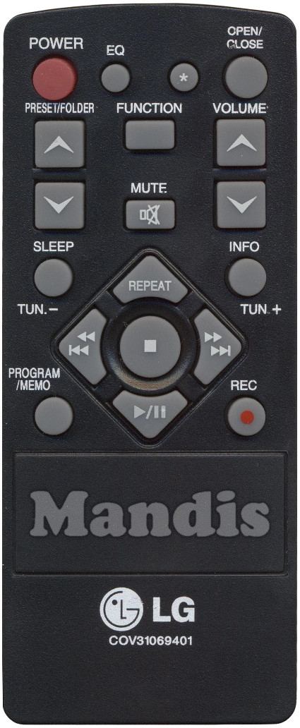 Power, EQ, *, Open / Close, Preset / Folder +, Preset / Folder -, Function, Mute, Volume+, Volume-, Sleep, Info, Repeat, << / I<< / Tun-, Stop, >> / >>I / Tun+, Play / Pause, Program / Memo, Rec