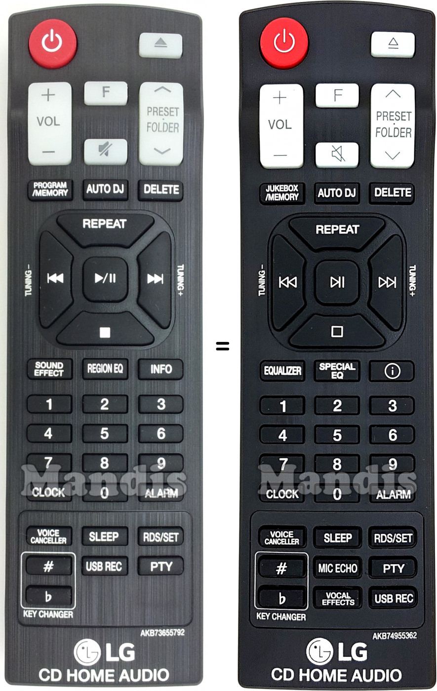 Questo telecomando ha i seguenti tasti: Power, Open / Close, Vol +, Vol -, F, Mute, Folder/Preset +, Folder/Preset -, Jukebox / Memory, Auto DJ, Delete, Repeat, Stop, >>I / Tuning +, I<< / Tuning -, Play / Pause, Equalizer, Special EQ, i, 1, 2, 3, 4, 5, 6, 7, 8, 9, 0, Clock, Alarm, Voice Canceller, Sleep, RDS / Set, Key Changer #, Key Changer b, Mic Echo, PTY, Vocal Effects, USB Rec