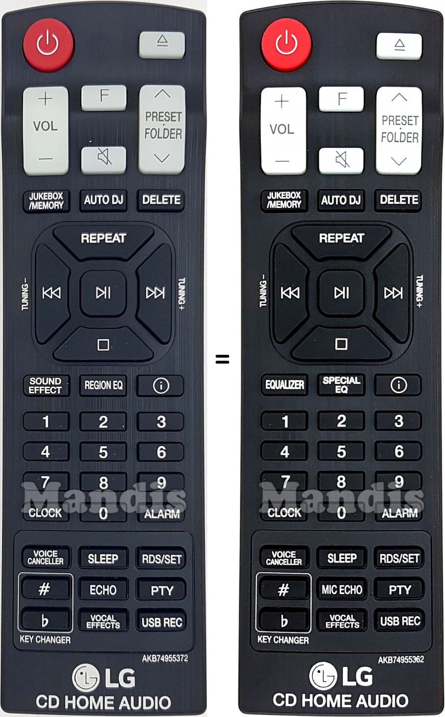 Questo telecomando ha i seguenti tasti: Power, Open / Close, Vol +, Vol -, F, Mute, Folder/Preset +, Folder/Preset -, Jukebox / Memory, Auto DJ, Delete, Repeat, Stop, >>I / Tuning +, I<< / Tuning -, Play / Pause, Equalizer, Special EQ, i, 1, 2, 3, 4, 5, 6, 7, 8, 9, 0, Clock, Alarm, Voice Canceller, Sleep, RDS / Set, Key Changer #, Key Changer b, Mic Echo, PTY, Vocal Effects, USB Rec