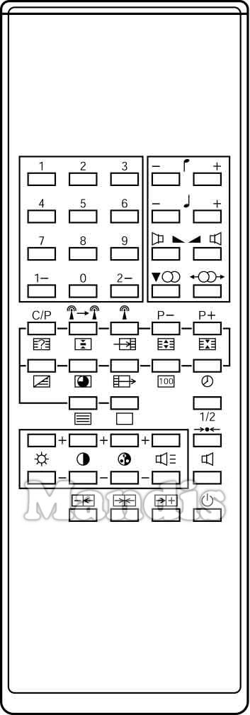 1, 3, 3, 4, 5, 6, 7, 8, 9, 0, 1-, 2-, |˙-, |˙+, ♩-, ♩+, ◣◢ Left, ◣◢ Right, ▼OO, ←OO→, C/P / Reveal, ↟→↟ / Freeze, ↟ / →≡, P- / Text Size, P+ / Text Hold, Mix, Subcode, ≡→, [100], Timer, Text, ▢, 1/2, Brightness+, Brightness-, Contrast+, Contrast-, Color+, Color-, Vol+, Vol-, →•←, Mute, -←, →|←, →+, Power