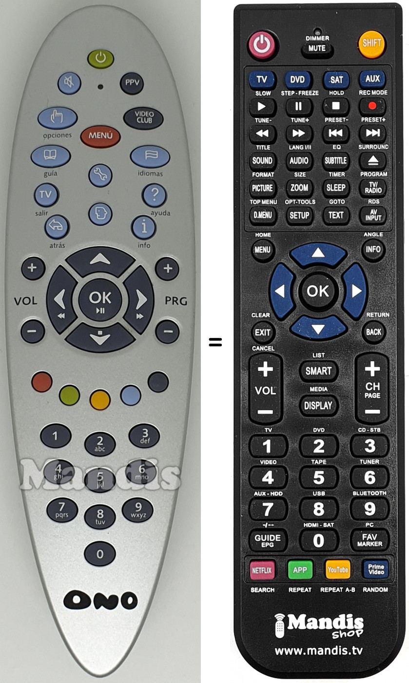 Il telecomando equivalente esegue tutte le funzioni, anche quando il controllo originale controlla vari dispositivi, nel controllo equivalente è possibile programmare diversi dispositivi (TV, DVD, SAT e AUX) in questo modo è possibile includere tutte le funzioni del telecomando originale. Se vedi il manuale dei tasti (istruzioni sul telecomando) puoi verificare che tutte le funzioni siano presenti.