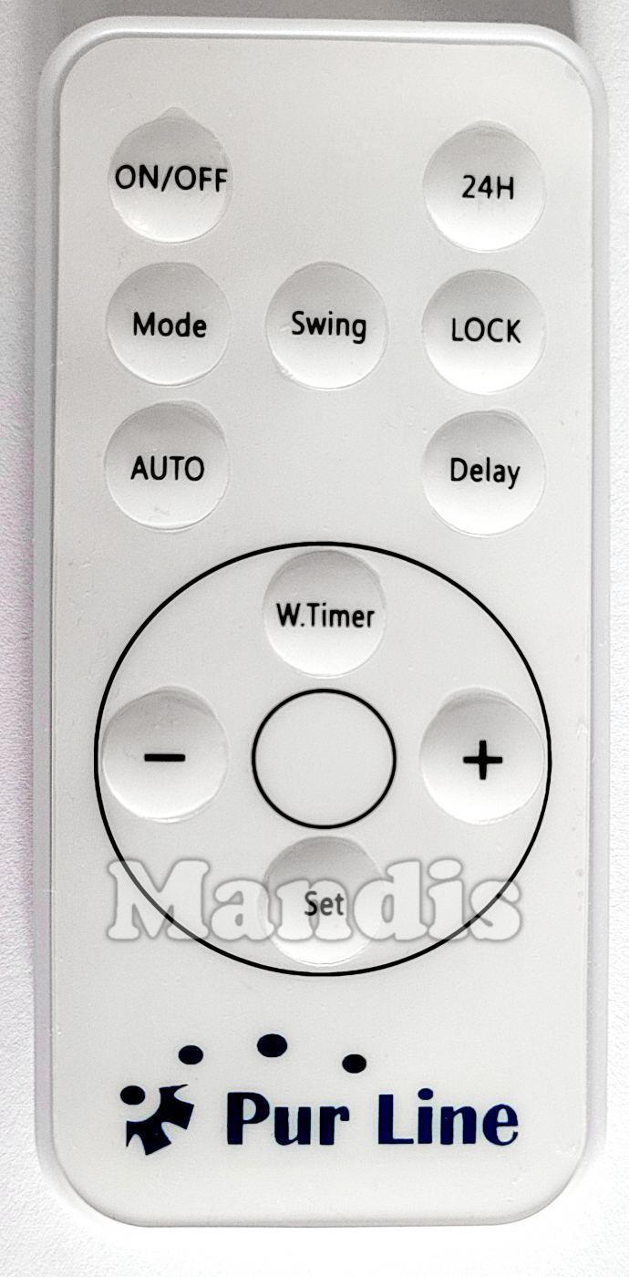 On/Off, 24H, Mode, Swing, Lock, Auto, Delay, W.Timer, Set, +, -