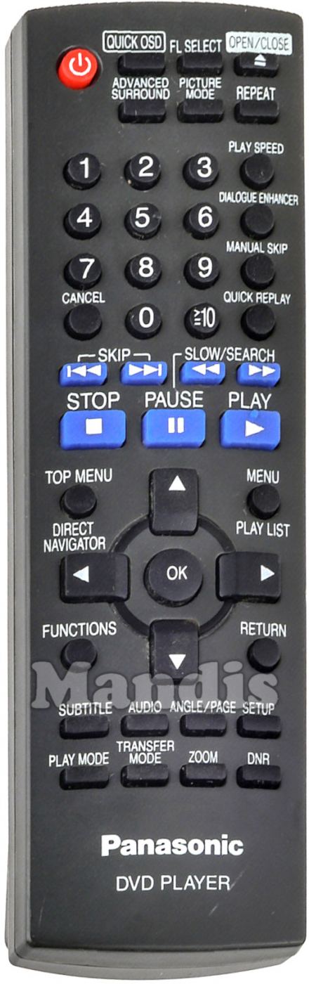 Power, Quick OSD, FL Select, Open / Close, Advanced Surround, Picture Mode, Repeat, 1, 2, 3, 4, 5, 6, 7, 8, 9, 0, ≧10, Cancel, Play Speed, Dialogue Enhancer, Manual Skip, Quick Replay, I<< Skip, Skip >>I, << Slow/Search, Slow/Search >>, Stop, Pause, Play, Top Menu / Direct Navigator, Menu / Play List, Up, Left, OK, Right, Down, Functions, Return, Subtitle, Audio, Angle / Page, Setup, Play Mode, Transfer Mode, Zoom, DNR