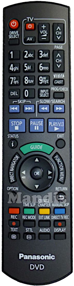 Power, Drive Select, TV Power, TV AV, TV Vol+, TV Vol-, TV CH+, TV CH-, 1, 2, 3, 4, 5, 6, 7, 8, 9, 0, DEL, Input Select, CH+ / Page+, CH- / Page-, Viera Cast, Prog / Check, I<< Skip, Skip >>I, << Slow/Search, Slow/Search >>, Stop, Pause, Play / x1.3, i / Status, Exit, Guide, Direct Navigator, Function Menu, Up, Left / <II, OK, Right / II>, Down, Option, Return, Red, Green / Time Slip, Yellow / Create Chapter, Blue / Manual Skip, Rec, Rec Mode, Ext Link, Direct TV Rec, Text, STTL, Audio, Display