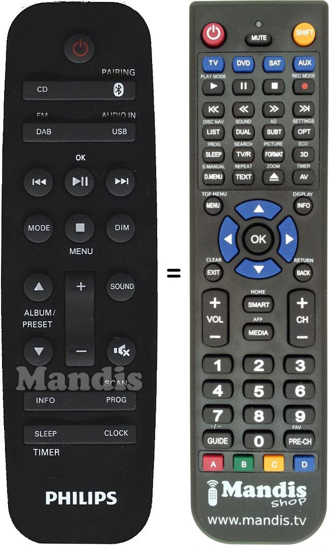 Di seguito, vi mostreremo la corrispondenza tra ciascun pulsante del telecomando originale e il pulsante che svolge la stessa funzione sul telecomando di sostituzione. In alcuni casi, potrebbe essere necessario premere il tasto SHIFT prima di premere un altro pulsante per eseguire determinate azioni. Queste funzioni aggiuntive sono spesso poco utilizzate e sono incluse per facilitare la comprensione del telecomando di sostituzione, o perché il telecomando originale ha più pulsanti rispetto al suo equivalente.