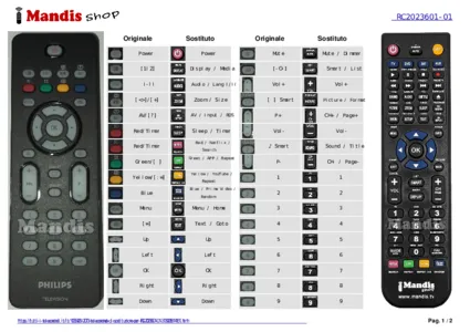 Questo telecomando esegue tutte le funzioni del telecomando originale: Power, [1I2], I-II, [<>]/[+], AV/[?], Red/Timer, Green/[ ], Yellow/[:=], Blue, Menu, [=], [-O-], Mute, [ ] Smart, ♪ Smart, Vol+, Vol-, P+, P-, Up, Down, Left, Right, OK, 1, 2, 3, 4, 5, 6, 7, 8, 9, 0, [i+], P<P