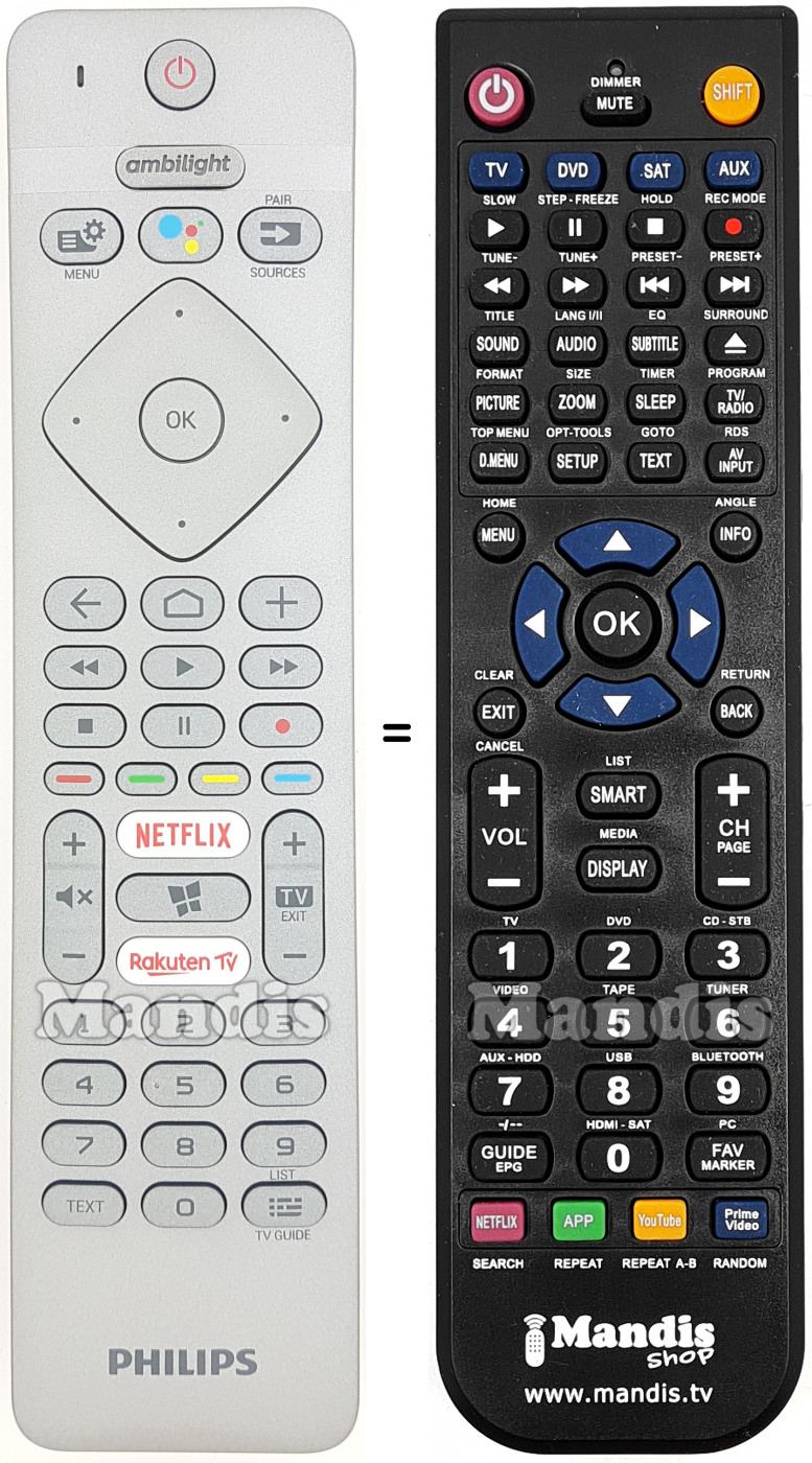 Di seguito, vi mostreremo la corrispondenza tra ciascun pulsante del telecomando originale e il pulsante che svolge la stessa funzione sul telecomando di sostituzione. In alcuni casi, potrebbe essere necessario premere il tasto SHIFT prima di premere un altro pulsante per eseguire determinate azioni. Queste funzioni aggiuntive sono spesso poco utilizzate e sono incluse per facilitare la comprensione del telecomando di sostituzione, o perché il telecomando originale ha più pulsanti rispetto al suo equivalente.