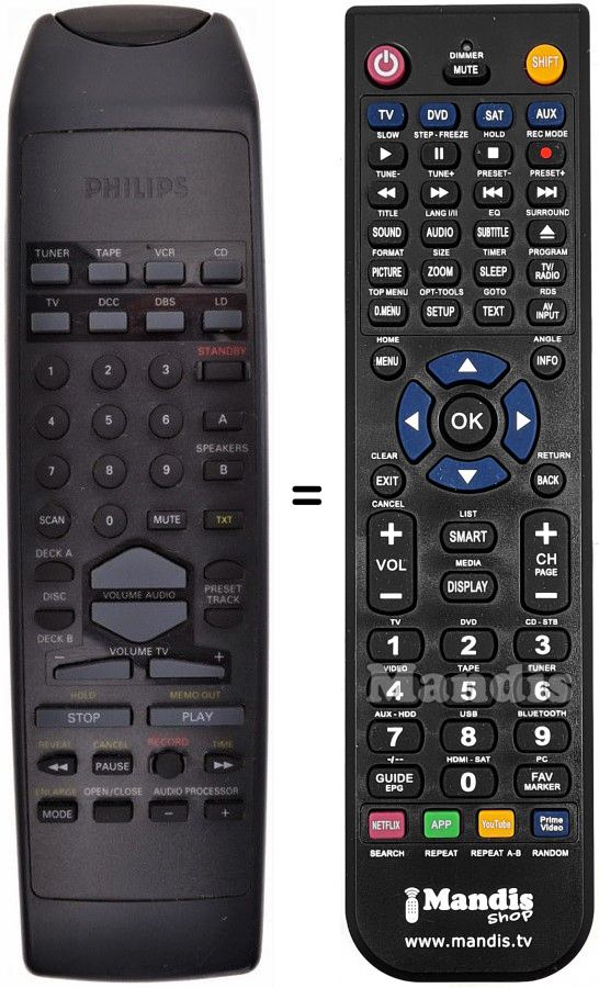 Di seguito, vi mostreremo la corrispondenza tra ciascun pulsante del telecomando originale e il pulsante che svolge la stessa funzione sul telecomando di sostituzione. In alcuni casi, potrebbe essere necessario premere il tasto SHIFT prima di premere un altro pulsante per eseguire determinate azioni. Queste funzioni aggiuntive sono spesso poco utilizzate e sono incluse per facilitare la comprensione del telecomando di sostituzione, o perché il telecomando originale ha più pulsanti rispetto al suo equivalente.