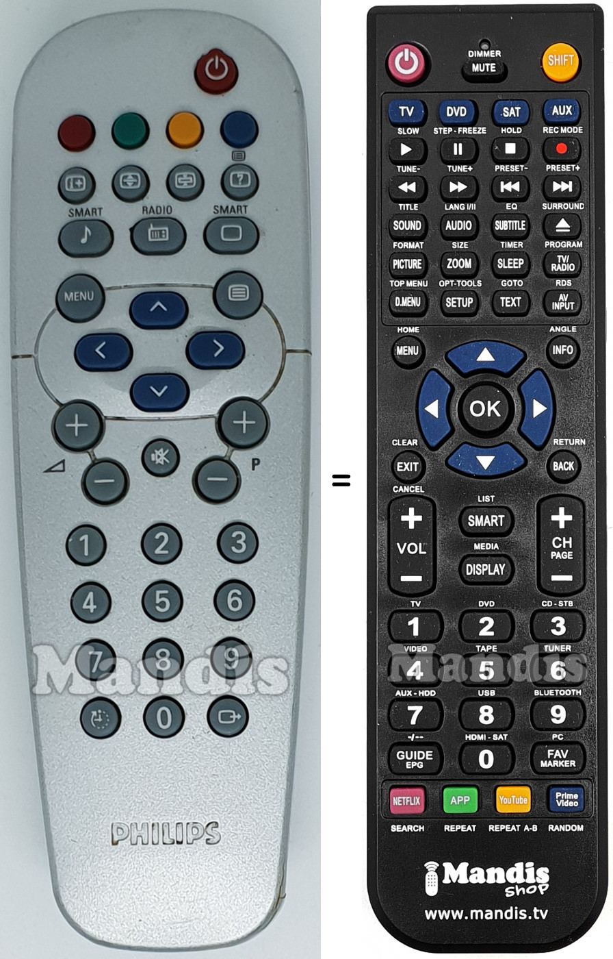 Questo telecomando esegue tutte le funzioni del telecomando originale: Power, Red, Green, Yellow, Blue, [i+], [÷], [⧗], [?]/[⋮☰], ♪, Radio, ▭, Menu, [≡], Up, Down, Left, Right, Vol+, Vol-, Mute, P+, P-, 1, 2, 3, 4, 5, 6, 7, 8, 9, 0, ◴, ▭→