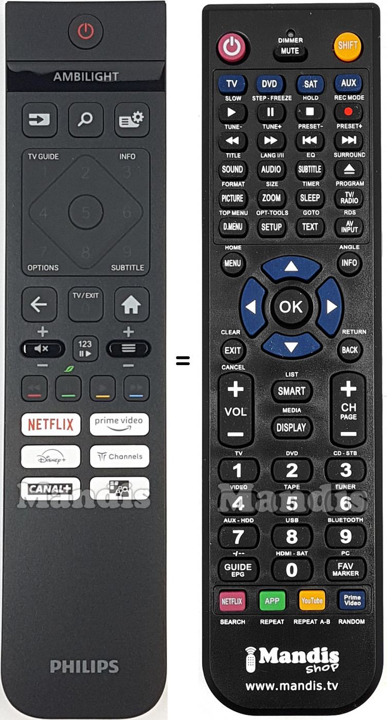 Di seguito, vi mostreremo la corrispondenza tra ciascun pulsante del telecomando originale e il pulsante che svolge la stessa funzione sul telecomando di sostituzione. In alcuni casi, potrebbe essere necessario premere il tasto SHIFT prima di premere un altro pulsante per eseguire determinate azioni. Queste funzioni aggiuntive sono spesso poco utilizzate e sono incluse per facilitare la comprensione del telecomando di sostituzione, o perché il telecomando originale ha più pulsanti rispetto al suo equivalente.