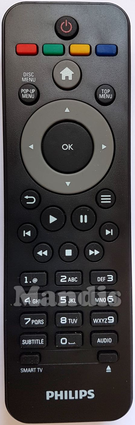Power, Red, Green, Yellow, Blue, Home, Pop-Up Menu / Disc Menu, Top Menu, Up, Down, Right, Left, OK, Back, Options, Play, Pause, I<, >I, <<, >>, Stop, 1, 2, 3, 4, 5, 6, 7, 8, 9, 0, Subtitle, Audio, Smart TV, Eject