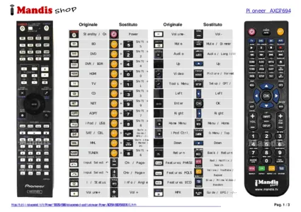 Questo telecomando esegue tutte le funzioni del telecomando originale: Standby / On, All Zone Stby / Discrete On / RCU Setup, Source Power, BD, DVD, DVR / BDR, HDMI, TV, CD, NET, ADPT, iPod / USB, SAT / CBL, MHL, TUNER, ← Input Select, Input Select →, i / Status, Receiver, TV Power, TV Input, TV CH+, TV CH-, TV Vol+, TV Vol-, Volume+, Volume-, Mute, Audio Parameter / Top Menu, Video Parameter / Tools / Menu, Up, Left, Enter, Right, Down, Home Menu / iPod CTRL, Return, PHASE, PCTRL+, PQLS, ECO, Pause / MPX, Play / Band, Stop / PTY, I<< / Preset-, >>I / Preset+, << / Tune-, >> / Tune+, 1 / Auto / ALC / Direct, 2 / Standard, 3 / Adv Surr, 4 / Signal Sel, 5 / MCACC, 6 / CH Level, 7 / Speakers, 8 / Dimmer, 9 / Sleep, 0 / HDMI Out, Rec / CLR / D.Access, Enter / Class, Audio / +Favorite, Disp / Auto S.RTRV, CH+ / Repeat, CH- / Random, Zone 2, Zone 3, HD Zone, Option