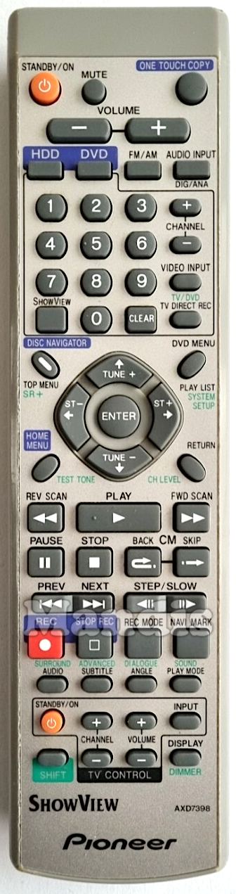 Standby / On, Mute, One Touch Copy, Volume-, Volume+, HDD, DVD, FM / AM, Audio Input Dig/Ana, 1, 2, 3, 4, 5, 6, 7, 8, 9, 0, ShowView, Clear, Channel+, Channel-, Video Input / TV/DVD, TV Direct Rec, Disc Navigator / Top Menu / SR+, DVD Menu / Play List / System Setup, Up / Tune+, Down / Tune-, Right / ST+, Left / ST-, Enter, Home Menu / Test Tone, Return / CH Level, << Rev Scan, Play, FWD Scan >>, Pause, Stop, CM Back, CM Skip, I<< Prev, Next >>I, <II Step/Slow, Step/Slow II>, Rec / Surround, Stop Rec / Advanced, Rec Mode / Dialog, Navi Mark / Sound, Audio, Subtitle, Angle, Play Mode, Display / Dimmer, TV Standby/On, TV Channel+, TV Channel-, TV Volume+, TV Volume-, TV Input, Shift