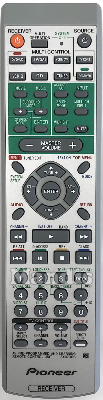 Power Receiver, Multi Operation, Receiver, TV Cont, Power Source, DVD / LD, TV / SAT, VCR 1 / DVR, VCR 2, CD, TUNER, Surround Mode Movie, Surround Mode Music, Surround Mode Left, Surround Mode Right, Surround Mode Enter, Stereo / Direct, Acustic EQ, Input, SB CH Mode, Multi CH Input, Midnight, Mute, Master Volume-, Master Volume+, System Setup / Menu / Tuner Edit, Text On / Top Menu / Guide, Up / Tune+, Down / Tune-, Right / ST+, Left / ST-, Enter, Audio, Return, << / Channel-, Play / Text Off / Band, >> / Channel+, I<< / Ref Att / Red, Pause / D.Access / Green, Stop / MPX / Yellow, >>I / Class / Blue, 1 / Dimmer, 2 / Loudness, 3 / Tone, 4 / Signal Sel, 5 / DNR, 6 / Bass/Treble, 7 / Video Sel, 8 / HiBit, 9, Enter / Effect / CH.Sel, . / Disc / Tone/Bass/Treble+, 0 / +10 / Tone/Bass/Treble-, Sub Title, Remote SEtup, TV Power, TV Input Select, TV Channel+, TV Channel-, TV Volume+, TV Volume-