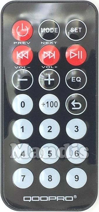 Power, Mode, SET, I<< PREV, >>I NEXT, Play/Pause, Vol-, Vol+, EQ, Back, 0, +100, 1, 2, 3, 4, 5, 6, 7, 8, 9