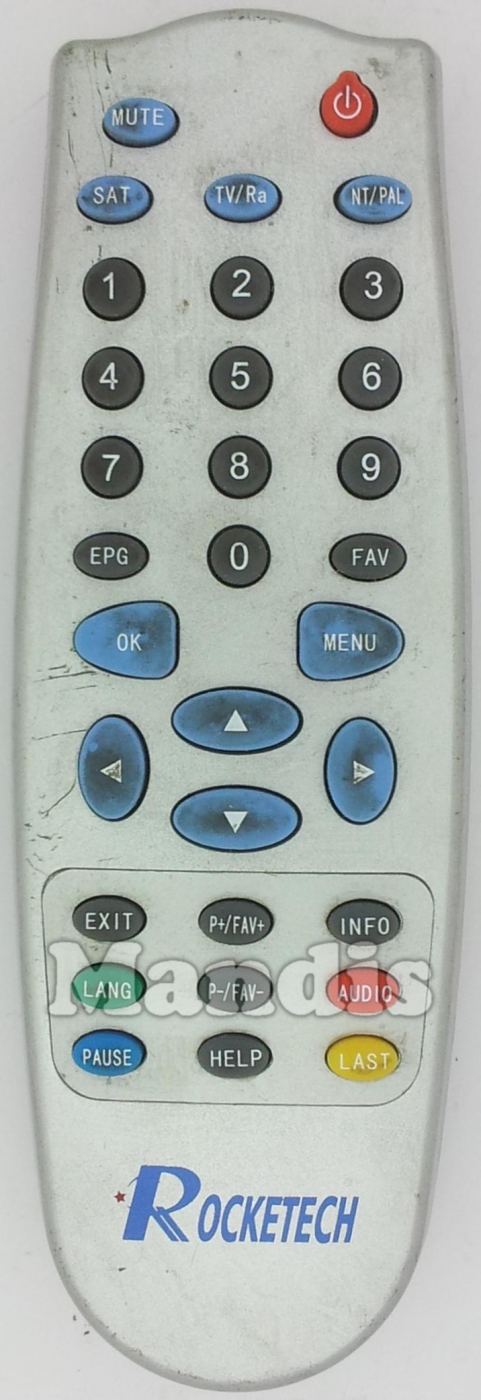 Mute, Power, SAT, TV/Ra, NT/PAL, 1, 2, 3, 4, 5, 6, 7, 8, 9, 0, EPG, FAV, OK, Menu, Up, Down, Left, Right, Exit, P+/FAV+, P-/FAV-, Info, Green/Lang., Red/Audio, Blue/Pause, Help, Yellow/Past