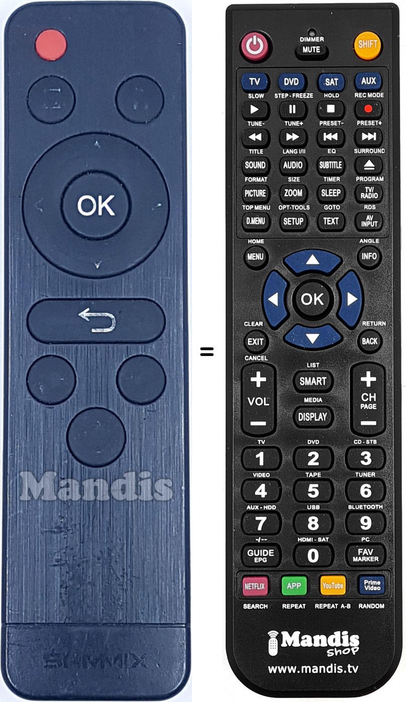 Il telecomando equivalente esegue tutte le funzioni, anche quando il controllo originale controlla vari dispositivi, nel controllo equivalente è possibile programmare diversi dispositivi (TV, DVD, SAT e AUX) in questo modo è possibile includere tutte le funzioni del telecomando originale. Se vedi il manuale dei tasti (istruzioni sul telecomando) puoi verificare che tutte le funzioni siano presenti.