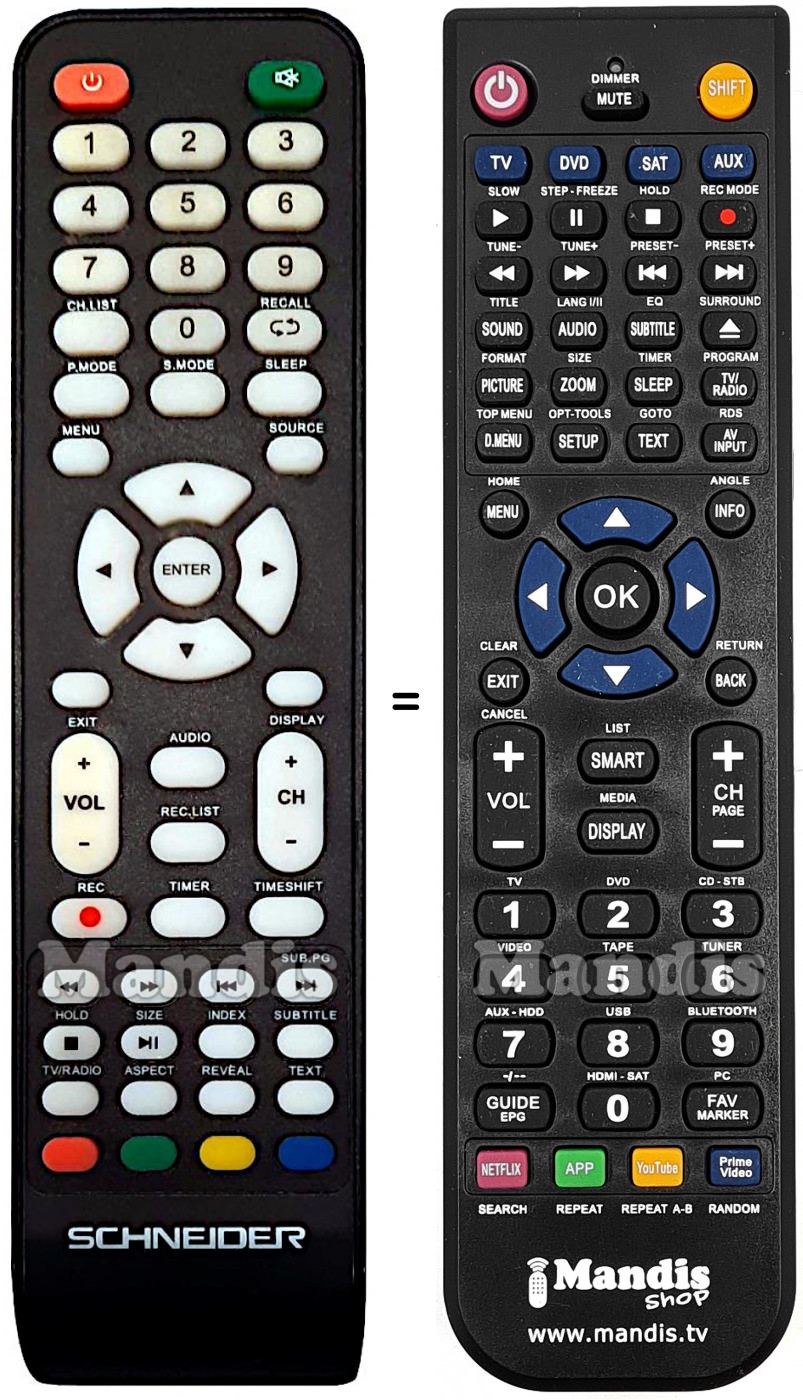 Di seguito, vi mostreremo la corrispondenza tra ciascun pulsante del telecomando originale e il pulsante che svolge la stessa funzione sul telecomando di sostituzione. In alcuni casi, potrebbe essere necessario premere il tasto SHIFT prima di premere un altro pulsante per eseguire determinate azioni. Queste funzioni aggiuntive sono spesso poco utilizzate e sono incluse per facilitare la comprensione del telecomando di sostituzione, o perché il telecomando originale ha più pulsanti rispetto al suo equivalente.