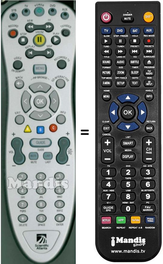 Telecomando che sostituisce l’originale ScientificAtlanta001 in tutte le sue funzioni.