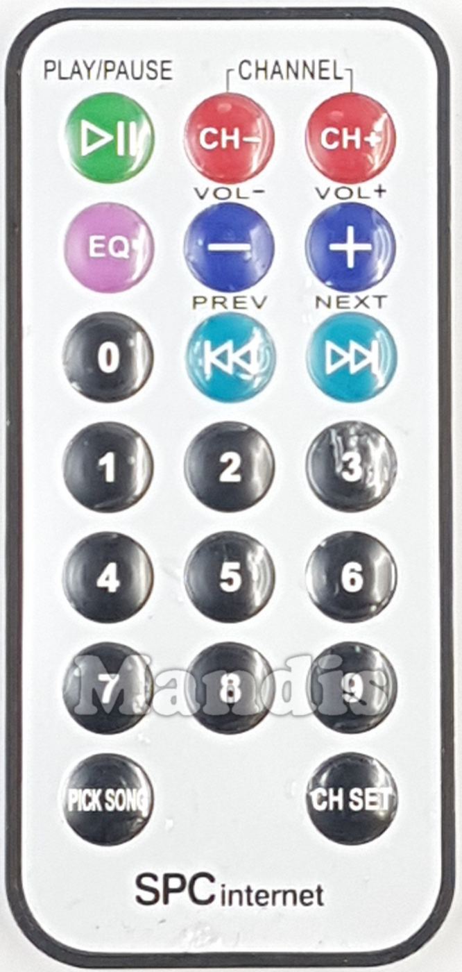 Play/Pause, CH-, CH+, EQ, Vol-, Vol+, I<< PREV, >>I NEXT, 0, 1, 2, 3, 4, 5, 6, 7, 8, 9, Pick Song, CH SET