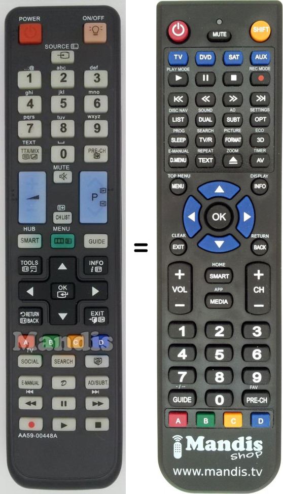 Di seguito, vi mostreremo la corrispondenza tra ciascun pulsante del telecomando originale e il pulsante che svolge la stessa funzione sul telecomando di sostituzione. In alcuni casi, potrebbe essere necessario premere il tasto SHIFT prima di premere un altro pulsante per eseguire determinate azioni. Queste funzioni aggiuntive sono spesso poco utilizzate e sono incluse per facilitare la comprensione del telecomando di sostituzione, o perché il telecomando originale ha più pulsanti rispetto al suo equivalente.