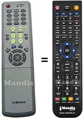 Questo telecomando esegue tutte le funzioni del telecomando originale: Power, Open / Close, Dimmer / TV/Video, MODE, DVD, Tuner Band, AUX, NTSC/PAL / EZ View, SO/ST / Slow, Sub Title, Step, DSP / EQ, Repeat, I<<, Stop, Play / Pause, >>I, Dolby PL II Mode, Dolby PL II Effect, Volume +, Volume -, Tuning + / CH +, Tuning - / CH -, Return, Menu, Info, Mute, Up, Down, Left, Enter, Right, 1 / RDS Display, 2, 3 / TA, 4 / PTY -, 5 / PTY Search, 6 / PTY +, 7, 8, 9, 0, Sleep, Cancel, Test Tone, Sound Edit, P.Scan / Tuner Memory, Zoom, Logo, Slide Mode, Digest, Remain