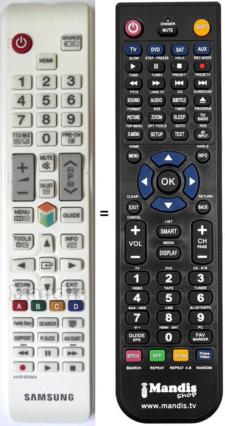 Telecomando che sostituisce l’originale AA59-00560A in tutte le sue funzioni. Non si tratta di un telecomando universale ma di un telecomando che sostituisce l’originale. Riceverà il telecomando completamente pronto per il suo funzionamento, deve solo mettere le pile. Non è necessario programmarlo. Le diamo garanzia totale che il telecomando compirà le stesse funzioni del telecomando originale.
