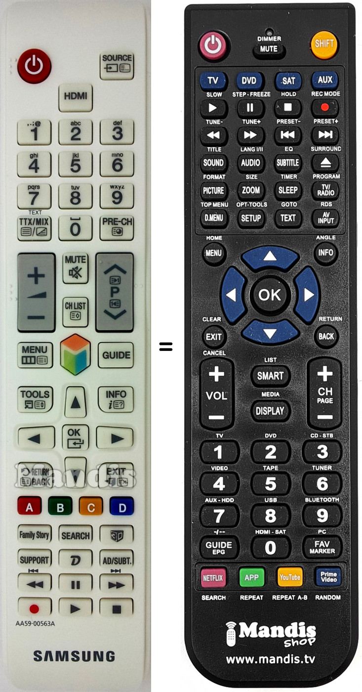 Telecomando che sostituisce l’originale AA59-00563A in tutte le sue funzioni. Non si tratta di un telecomando universale ma di un telecomando che sostituisce l’originale. Riceverà il telecomando completamente pronto per il suo funzionamento, deve solo mettere le pile. Non è necessario programmarlo. Le diamo garanzia totale che il telecomando compirà le stesse funzioni del telecomando originale.