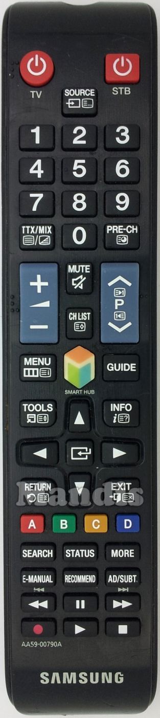Power TV, Power STB, Source, 1, 2, 3, 4, 5, 6, 7, 8, 9, 0, TTX / MIX, Pre-Ch, Vol +, Vol -, Mute, CH List, P +, P -, Menu, Smart Hub, Guide, Tools, Info, Up, Down, Right, Left, , Return, Exit, Red / A, Green / B, Yellow / C, Blue / D, Search, Status, More, E-Manual, Recommended, AD / Subt., << / I<<, Pause, >> / >>I, Rec, Play, Stop