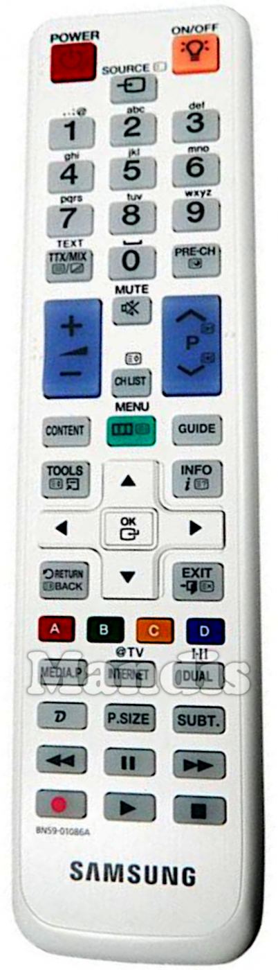 Power, Light On/Off, Source, 1, 2, 3, 4, 5, 6, 7, 8, 9, 0, TTX/MIX, PRE-CH, Mute, Vol+, Vol-, CH List, P+, P-, Content, Menu, Guide, Tools, Info, Up, Left, OK, Right, Down, Return / Back, Exit, Red, Green, Yellow, Blue, Media.P, Internet / @TV, Dual I-II, D, P.Size, Subt., <<, Pause, >>, Rec, Play, Stop